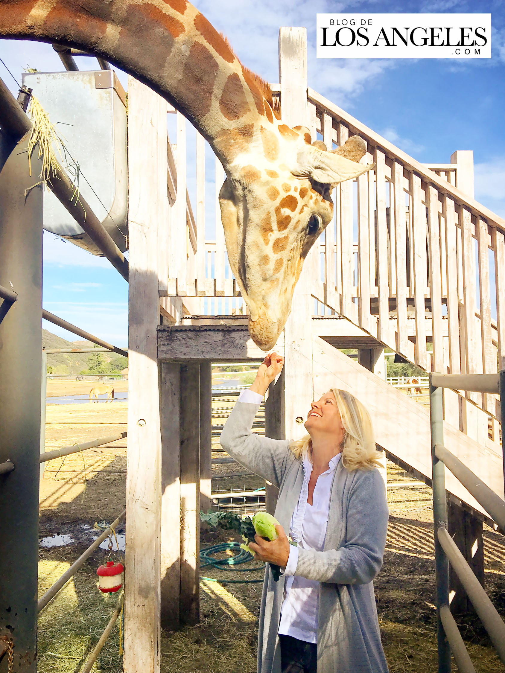 "Mi marido siempre quiso tener una jirafa en el rancho, pero parecía inconcebible llevarlo a cabo. Hasta que Ron escuchó que Stanley se estaba retirando de su vida como estrella de anuncios y películas de Hollywood… ¿Te acuerdas de la jirafa que va en un trailer y pierde la cabeza contra un puente en Hangover 3? Pues es ella. Al cumplir cinco años, se estaba haciendo demasiado grande para moverla de una locación a otra en los rodajes. Así que se jubiló y nos la trajimos para acá". –No te pierdas el link al final de la entrevista si quieres ver actuar a Stanley cuando era una estrella en activo.