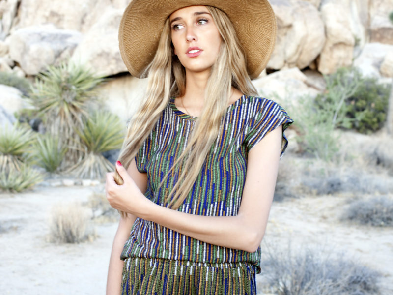 Hace poco vi mi primera serpiente californiana durante un hike en las montañas de Santa Mónica. Su piel era preciosa, brillante, de rayas y vivos colores. Lógicamente, al pensar en el desierto, se me vino a la cabeza la cantidad de snakes que debía de haber allí… Por eso escogí un look de rayas finas, colores vivos y brillantes, con una textura similar a la de su piel. ¡Perfecto outfit para el desierto! Y de paso, así mimetizarme con el ambiente en la medida de lo posible y pasar desapercibida, en el caso de que al final una de ellas decida cruzarse en mi camino, jaja…